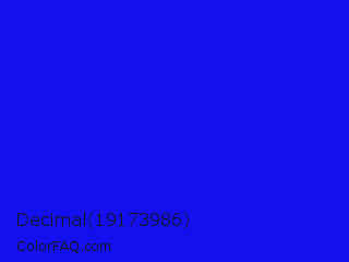 Decimal 19173986 Color is a normal indigo color and the nearest color is Bluebonnet #1c1cf0. Hex code #130fee and RGB value is rgb(19,15,238). In RGB color space, this color is composed of 7% red, 6% green, 93% blue, In CMYK color space, this color is composed of 92% cyan, 94% magenta, 0% yellow , 7% black , In HSL color space, this color has a hue angle of 241° , 88% saturation and 50% lightness.