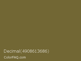 Decimal 4908613686 Color is a normal yellow color and the nearest color is Yellow Metal #716338. Hex code #726734 and RGB value is rgb(114,103,52). In RGB color space, this color is composed of 45% red, 40% green, 20% blue, In CMYK color space, this color is composed of 0% cyan, 10% magenta, 54% yellow , 55% black , In HSL color space, this color has a hue angle of 49° , 37% saturation and 33% lightness.