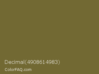 Decimal 4908614983 Color is a normal yellow color and the nearest color is Yellow Metal #716338. Hex code #726933 and RGB value is rgb(114,105,51). In RGB color space, this color is composed of 45% red, 41% green, 20% blue, In CMYK color space, this color is composed of 0% cyan, 8% magenta, 55% yellow , 55% black , In HSL color space, this color has a hue angle of 51° , 38% saturation and 32% lightness.