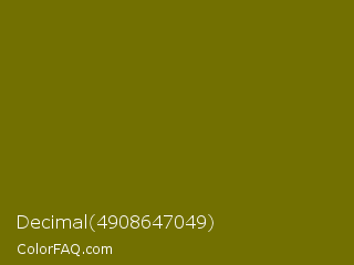 Decimal 4908647049 Color is a dark yellow color and the nearest color is Bronze Yellow #737000. Hex code #727001 and RGB value is rgb(114,112,1). In RGB color space, this color is composed of 45% red, 44% green, 0% blue, In CMYK color space, this color is composed of 0% cyan, 2% magenta, 99% yellow , 55% black , In HSL color space, this color has a hue angle of 59° , 98% saturation and 23% lightness.