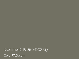 Decimal 4908648003 Color is a normal yellow color and the nearest color is Pablo #776f61. Hex code #727163 and RGB value is rgb(114,113,99). In RGB color space, this color is composed of 45% red, 44% green, 39% blue, In CMYK color space, this color is composed of 0% cyan, 1% magenta, 13% yellow , 55% black , In HSL color space, this color has a hue angle of 56° , 7% saturation and 42% lightness.