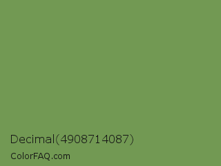 Decimal 4908714087 Color is a normal green color and the nearest color is Asparagus Green #7ba05b. Hex code #729953 and RGB value is rgb(114,153,83). In RGB color space, this color is composed of 45% red, 60% green, 33% blue, In CMYK color space, this color is composed of 25% cyan, 0% magenta, 46% yellow , 40% black , In HSL color space, this color has a hue angle of 93° , 30% saturation and 46% lightness.