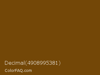 Decimal 4908995381 Color is a dark orange color and the nearest color is Antique Bronze #704a07. Hex code #734707 and RGB value is rgb(115,71,7). In RGB color space, this color is composed of 45% red, 28% green, 3% blue, In CMYK color space, this color is composed of 0% cyan, 38% magenta, 94% yellow , 55% black , In HSL color space, this color has a hue angle of 36° , 89% saturation and 24% lightness.
