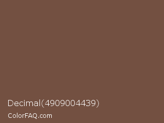 Decimal 4909004439 Color is a normal orange color and the nearest color is Tuscan Brown Coffee #6f4e37. Hex code #735041 and RGB value is rgb(115,80,65). In RGB color space, this color is composed of 45% red, 31% green, 25% blue, In CMYK color space, this color is composed of 0% cyan, 30% magenta, 43% yellow , 55% black , In HSL color space, this color has a hue angle of 18° , 28% saturation and 35% lightness.