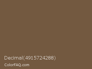 Decimal 4915724288 Color is a normal orange color and the nearest color is Tobacco Brown #715d47. Hex code #735940 and RGB value is rgb(115,89,64). In RGB color space, this color is composed of 45% red, 35% green, 25% blue, In CMYK color space, this color is composed of 0% cyan, 23% magenta, 44% yellow , 55% black , In HSL color space, this color has a hue angle of 29° , 28% saturation and 35% lightness.