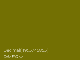 Decimal 4915746855 Color is a dark yellow color and the nearest color is Bronze Yellow #737000. Hex code #737003 and RGB value is rgb(115,112,3). In RGB color space, this color is composed of 45% red, 44% green, 1% blue, In CMYK color space, this color is composed of 0% cyan, 3% magenta, 97% yellow , 55% black , In HSL color space, this color has a hue angle of 58° , 95% saturation and 23% lightness.