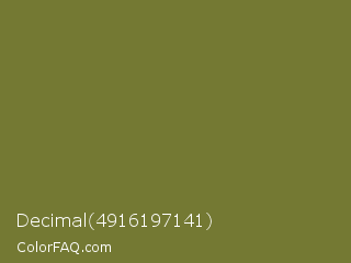 Decimal 4916197141 Color is a normal yellow color and the nearest color is Pesto #7c7631. Hex code #747933 and RGB value is rgb(116,121,51). In RGB color space, this color is composed of 45% red, 47% green, 20% blue, In CMYK color space, this color is composed of 4% cyan, 0% magenta, 58% yellow , 53% black , In HSL color space, this color has a hue angle of 64° , 41% saturation and 34% lightness.