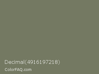 Decimal 4916197218 Color is a normal lime color and the nearest color is Limed Ash #747d63. Hex code #747962 and RGB value is rgb(116,121,98). In RGB color space, this color is composed of 45% red, 47% green, 38% blue, In CMYK color space, this color is composed of 4% cyan, 0% magenta, 19% yellow , 53% black , In HSL color space, this color has a hue angle of 73° , 11% saturation and 43% lightness.