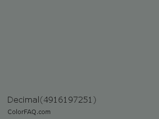 Decimal 4916197251 Color is a normal green color and the nearest color is Sonic Silver #757575. Hex code #747977 and RGB value is rgb(116,121,119). In RGB color space, this color is composed of 45% red, 47% green, 47% blue, In CMYK color space, this color is composed of 4% cyan, 0% magenta, 2% yellow , 53% black , In HSL color space, this color has a hue angle of 156° , 2% saturation and 46% lightness.