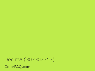 Decimal 307307313 Color is a light lime color and the nearest color is Inchworm #b2ec5d. Hex code #beec4b and RGB value is rgb(190,236,75). In RGB color space, this color is composed of 75% red, 93% green, 29% blue, In CMYK color space, this color is composed of 19% cyan, 0% magenta, 68% yellow , 7% black , In HSL color space, this color has a hue angle of 77° , 81% saturation and 61% lightness.