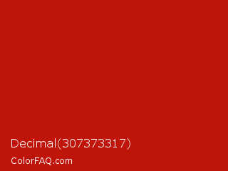 Decimal 307373317 Color is a normal red color and the nearest color is International Orange Engineering #ba160c. Hex code #bf1409 and RGB value is rgb(191,20,9). In RGB color space, this color is composed of 75% red, 8% green, 4% blue, In CMYK color space, this color is composed of 0% cyan, 90% magenta, 95% yellow , 25% black , In HSL color space, this color has a hue angle of 4° , 91% saturation and 39% lightness.