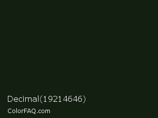 Decimal 19214646 Color is a almost black green color and the nearest color is Hunter Green #161d10. Hex code #131f10 and RGB value is rgb(19,31,16). In RGB color space, this color is composed of 7% red, 12% green, 6% blue, In CMYK color space, this color is composed of 39% cyan, 0% magenta, 48% yellow , 88% black , In HSL color space, this color has a hue angle of 108° , 32% saturation and 9% lightness.