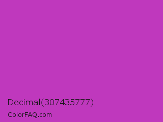 Decimal 307435777 Color is a normal magenta color and the nearest color is Steel Pink #cc33cc. Hex code #bf38bd and RGB value is rgb(191,56,189). In RGB color space, this color is composed of 75% red, 22% green, 74% blue, In CMYK color space, this color is composed of 0% cyan, 71% magenta, 1% yellow , 25% black , In HSL color space, this color has a hue angle of 301° , 55% saturation and 48% lightness.