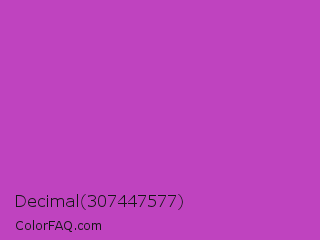 Decimal 307447577 Color is a normal magenta color and the nearest color is Fuchsia Pink #c154c1. Hex code #bf43bf and RGB value is rgb(191,67,191). In RGB color space, this color is composed of 75% red, 26% green, 75% blue, In CMYK color space, this color is composed of 0% cyan, 65% magenta, 0% yellow , 25% black , In HSL color space, this color has a hue angle of 300° , 49% saturation and 51% lightness.