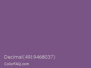 Decimal 4919468037 Color is a normal purple color and the nearest color is Chinese Violet #856088. Hex code #795485 and RGB value is rgb(121,84,133). In RGB color space, this color is composed of 47% red, 33% green, 52% blue, In CMYK color space, this color is composed of 9% cyan, 37% magenta, 0% yellow , 48% black , In HSL color space, this color has a hue angle of 285° , 23% saturation and 43% lightness.