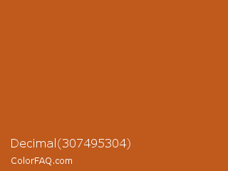 Decimal 307495304 Color is a normal orange color and the nearest color is Orange Roughy #c45719. Hex code #bf591c and RGB value is rgb(191,89,28). In RGB color space, this color is composed of 75% red, 35% green, 11% blue, In CMYK color space, this color is composed of 0% cyan, 53% magenta, 85% yellow , 25% black , In HSL color space, this color has a hue angle of 22° , 74% saturation and 43% lightness.