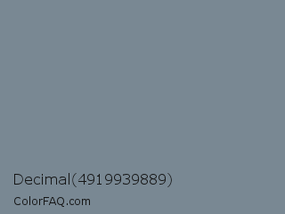 Decimal 4919939889 Color is a normal blue color and the nearest color is Light Slate Gray #778899. Hex code #798893 and RGB value is rgb(121,136,147). In RGB color space, this color is composed of 47% red, 53% green, 58% blue, In CMYK color space, this color is composed of 18% cyan, 7% magenta, 0% yellow , 42% black , In HSL color space, this color has a hue angle of 205° , 11% saturation and 53% lightness.