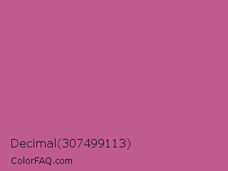Decimal 307499113 Color is a normal rose color and the nearest color is Mulberry #c54b8c. Hex code #bf5c8d and RGB value is rgb(191,92,141). In RGB color space, this color is composed of 75% red, 36% green, 55% blue, In CMYK color space, this color is composed of 0% cyan, 52% magenta, 26% yellow , 25% black , In HSL color space, this color has a hue angle of 330° , 44% saturation and 55% lightness.