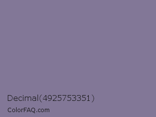 Decimal 4925753351 Color is a normal violet color and the nearest color is Waterloo #7b7c94. Hex code #827797 and RGB value is rgb(130,119,151). In RGB color space, this color is composed of 51% red, 47% green, 59% blue, In CMYK color space, this color is composed of 14% cyan, 21% magenta, 0% yellow , 41% black , In HSL color space, this color has a hue angle of 261° , 13% saturation and 53% lightness.
