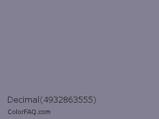 Decimal 4932863555 Color is a normal indigo color and the nearest color is Waterloo #7b7c94. Hex code #838093 and RGB value is rgb(131,128,147). In RGB color space, this color is composed of 51% red, 50% green, 58% blue, In CMYK color space, this color is composed of 11% cyan, 13% magenta, 0% yellow , 42% black , In HSL color space, this color has a hue angle of 249° , 8% saturation and 54% lightness.