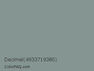 Decimal 4933719380 Color is a normal cyan color and the nearest color is Oslo Gray #878d91. Hex code #849592 and RGB value is rgb(132,149,146). In RGB color space, this color is composed of 52% red, 58% green, 57% blue, In CMYK color space, this color is composed of 11% cyan, 0% magenta, 2% yellow , 42% black , In HSL color space, this color has a hue angle of 169° , 7% saturation and 55% lightness.
