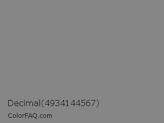 Decimal 4934144567 Color is a normal green color and the nearest color is Gunsmoke #828685. Hex code #858685 and RGB value is rgb(133,134,133). In RGB color space, this color is composed of 52% red, 53% green, 52% blue, In CMYK color space, this color is composed of 1% cyan, 0% magenta, 1% yellow , 47% black , In HSL color space, this color has a hue angle of 120° , 0% saturation and 52% lightness.
