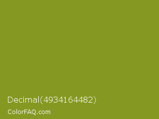 Decimal 4934164482 Color is a normal yellow color and the nearest color is Wasabi #788a25. Hex code #859922 and RGB value is rgb(133,153,34). In RGB color space, this color is composed of 52% red, 60% green, 13% blue, In CMYK color space, this color is composed of 13% cyan, 0% magenta, 78% yellow , 40% black , In HSL color space, this color has a hue angle of 70° , 64% saturation and 37% lightness.