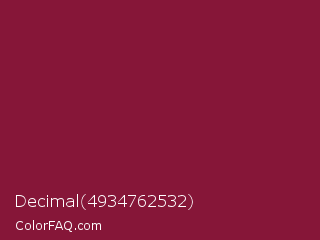 Decimal 4934762532 Color is a normal rose color and the nearest color is Claret #7f1734. Hex code #861638 and RGB value is rgb(134,22,56). In RGB color space, this color is composed of 53% red, 9% green, 22% blue, In CMYK color space, this color is composed of 0% cyan, 84% magenta, 58% yellow , 47% black , In HSL color space, this color has a hue angle of 342° , 72% saturation and 31% lightness.