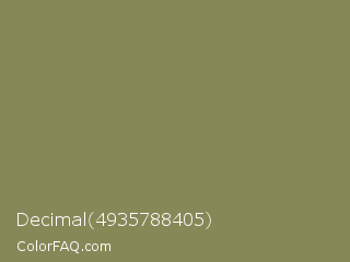 Decimal 4935788405 Color is a normal yellow color and the nearest color is Clay Creek #8a8360. Hex code #878857 and RGB value is rgb(135,136,87). In RGB color space, this color is composed of 53% red, 53% green, 34% blue, In CMYK color space, this color is composed of 1% cyan, 0% magenta, 36% yellow , 47% black , In HSL color space, this color has a hue angle of 61° , 22% saturation and 44% lightness.