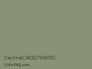 Decimal 4935799655 Color is a normal green color and the nearest color is Battleship Gray #828f72. Hex code #879277 and RGB value is rgb(135,146,119). In RGB color space, this color is composed of 53% red, 57% green, 47% blue, In CMYK color space, this color is composed of 8% cyan, 0% magenta, 18% yellow , 43% black , In HSL color space, this color has a hue angle of 84° , 11% saturation and 52% lightness.
