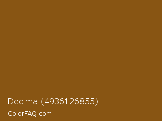 Decimal 4936126855 Color is a dark orange color and the nearest color is Grizzly #885818. Hex code #885513 and RGB value is rgb(136,85,19). In RGB color space, this color is composed of 53% red, 33% green, 7% blue, In CMYK color space, this color is composed of 0% cyan, 38% magenta, 86% yellow , 47% black , In HSL color space, this color has a hue angle of 34° , 75% saturation and 30% lightness.