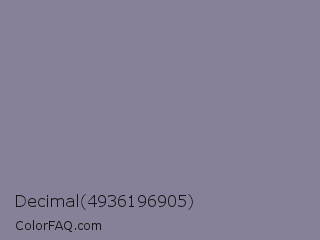 Decimal 4936196905 Color is a normal indigo color and the nearest color is Roman Silver #838996. Hex code #888099 and RGB value is rgb(136,128,153). In RGB color space, this color is composed of 53% red, 50% green, 60% blue, In CMYK color space, this color is composed of 11% cyan, 16% magenta, 0% yellow , 40% black , In HSL color space, this color has a hue angle of 259° , 11% saturation and 55% lightness.