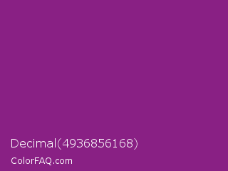 Decimal 4936856168 Color is a normal magenta color and the nearest color is Razzmic Berry Crayola #843179. Hex code #892084 and RGB value is rgb(137,32,132). In RGB color space, this color is composed of 54% red, 13% green, 52% blue, In CMYK color space, this color is composed of 0% cyan, 77% magenta, 4% yellow , 46% black , In HSL color space, this color has a hue angle of 303° , 62% saturation and 33% lightness.