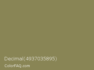 Decimal 4937035895 Color is a normal yellow color and the nearest color is Dark Tan #918151. Hex code #898555 and RGB value is rgb(137,133,85). In RGB color space, this color is composed of 54% red, 52% green, 33% blue, In CMYK color space, this color is composed of 0% cyan, 3% magenta, 38% yellow , 46% black , In HSL color space, this color has a hue angle of 55° , 23% saturation and 44% lightness.