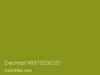 Decimal 4937053033 Color is a normal yellow color and the nearest color is Trendy Green #7c881a. Hex code #899619 and RGB value is rgb(137,150,25). In RGB color space, this color is composed of 54% red, 59% green, 10% blue, In CMYK color space, this color is composed of 9% cyan, 0% magenta, 83% yellow , 41% black , In HSL color space, this color has a hue angle of 66° , 71% saturation and 34% lightness.