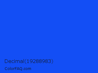 Decimal 19288983 Color is a normal blue color and the nearest color is Blue RYB #0247fe. Hex code #134ef5 and RGB value is rgb(19,78,245). In RGB color space, this color is composed of 7% red, 31% green, 96% blue, In CMYK color space, this color is composed of 92% cyan, 68% magenta, 0% yellow , 4% black , In HSL color space, this color has a hue angle of 224° , 92% saturation and 52% lightness.