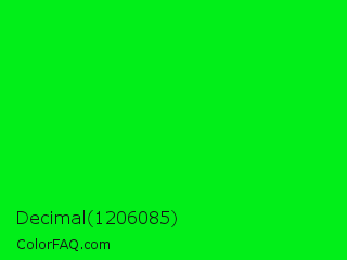 Decimal 1206085 Color is a normal green color and the nearest color is Green #00ff00. Hex code #01ef19 and RGB value is rgb(1,239,25). In RGB color space, this color is composed of 0% red, 94% green, 10% blue, In CMYK color space, this color is composed of 100% cyan, 0% magenta, 90% yellow , 6% black , In HSL color space, this color has a hue angle of 126° , 99% saturation and 47% lightness.