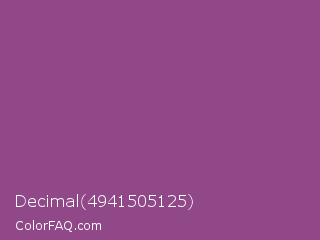Decimal 4941505125 Color is a normal magenta color and the nearest color is Plum #8e4585. Hex code #904889 and RGB value is rgb(144,72,137). In RGB color space, this color is composed of 56% red, 28% green, 54% blue, In CMYK color space, this color is composed of 0% cyan, 50% magenta, 5% yellow , 44% black , In HSL color space, this color has a hue angle of 306° , 33% saturation and 42% lightness.