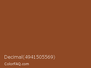 Decimal 4941505569 Color is a normal orange color and the nearest color is Cumin #924321. Hex code #904925 and RGB value is rgb(144,73,37). In RGB color space, this color is composed of 56% red, 29% green, 15% blue, In CMYK color space, this color is composed of 0% cyan, 49% magenta, 74% yellow , 44% black , In HSL color space, this color has a hue angle of 20° , 59% saturation and 35% lightness.