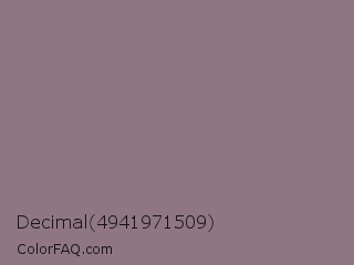 Decimal 4941971509 Color is a normal rose color and the nearest color is Rocket Metallic #8a7f80. Hex code #907683 and RGB value is rgb(144,118,131). In RGB color space, this color is composed of 56% red, 46% green, 51% blue, In CMYK color space, this color is composed of 0% cyan, 18% magenta, 9% yellow , 44% black , In HSL color space, this color has a hue angle of 330° , 10% saturation and 51% lightness.