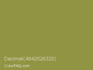 Decimal 4942026320 Color is a normal yellow color and the nearest color is Sycamore #908d39. Hex code #909442 and RGB value is rgb(144,148,66). In RGB color space, this color is composed of 56% red, 58% green, 26% blue, In CMYK color space, this color is composed of 3% cyan, 0% magenta, 55% yellow , 42% black , In HSL color space, this color has a hue angle of 63° , 38% saturation and 42% lightness.