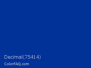 Decimal 75414 Color is a dark blue color and the nearest color is Smalt #003399. Hex code #003198 and RGB value is rgb(0,49,152). In RGB color space, this color is composed of 0% red, 19% green, 60% blue, In CMYK color space, this color is composed of 100% cyan, 68% magenta, 0% yellow , 40% black , In HSL color space, this color has a hue angle of 221° , 100% saturation and 30% lightness.