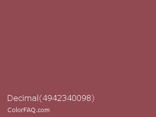 Decimal 4942340098 Color is a normal red color and the nearest color is Copper Rust #944747. Hex code #914952 and RGB value is rgb(145,73,82). In RGB color space, this color is composed of 57% red, 29% green, 32% blue, In CMYK color space, this color is composed of 0% cyan, 50% magenta, 43% yellow , 43% black , In HSL color space, this color has a hue angle of 353° , 33% saturation and 43% lightness.