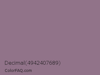 Decimal 4942407689 Color is a normal magenta color and the nearest color is Mountbatten Pink #997a8d. Hex code #917389 and RGB value is rgb(145,115,137). In RGB color space, this color is composed of 57% red, 45% green, 54% blue, In CMYK color space, this color is composed of 0% cyan, 21% magenta, 6% yellow , 43% black , In HSL color space, this color has a hue angle of 316° , 12% saturation and 51% lightness.