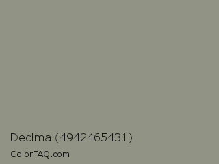Decimal 4942465431 Color is a normal yellow color and the nearest color is Stack #8a8f8a. Hex code #919385 and RGB value is rgb(145,147,133). In RGB color space, this color is composed of 57% red, 58% green, 52% blue, In CMYK color space, this color is composed of 1% cyan, 0% magenta, 10% yellow , 42% black , In HSL color space, this color has a hue angle of 69° , 6% saturation and 55% lightness.