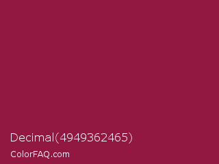 Decimal 4949362465 Color is a normal rose color and the nearest color is Big Dip O Ruby #9c2542. Hex code #921741 and RGB value is rgb(146,23,65). In RGB color space, this color is composed of 57% red, 9% green, 25% blue, In CMYK color space, this color is composed of 0% cyan, 84% magenta, 55% yellow , 43% black , In HSL color space, this color has a hue angle of 340° , 73% saturation and 33% lightness.