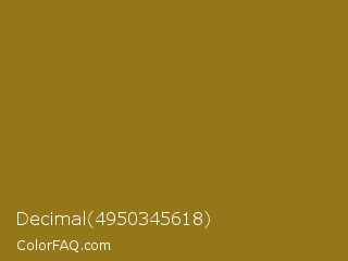 Decimal 4950345618 Color is a normal yellow color and the nearest color is Sand Dune #967117. Hex code #937718 and RGB value is rgb(147,119,24). In RGB color space, this color is composed of 58% red, 47% green, 9% blue, In CMYK color space, this color is composed of 0% cyan, 19% magenta, 84% yellow , 42% black , In HSL color space, this color has a hue angle of 46° , 72% saturation and 34% lightness.