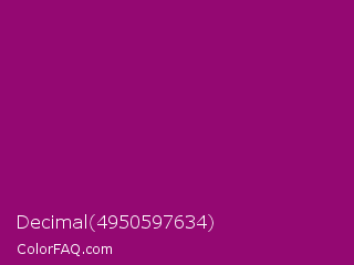 Decimal 4950597634 Color is a normal magenta color and the nearest color is Fresh Eggplant #990066. Hex code #940872 and RGB value is rgb(148,8,114). In RGB color space, this color is composed of 58% red, 3% green, 45% blue, In CMYK color space, this color is composed of 0% cyan, 95% magenta, 23% yellow , 42% black , In HSL color space, this color has a hue angle of 315° , 90% saturation and 31% lightness.