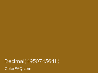 Decimal 4950745641 Color is a normal orange color and the nearest color is Golden Brown #996515. Hex code #946715 and RGB value is rgb(148,103,21). In RGB color space, this color is composed of 58% red, 40% green, 8% blue, In CMYK color space, this color is composed of 0% cyan, 30% magenta, 86% yellow , 42% black , In HSL color space, this color has a hue angle of 39° , 75% saturation and 33% lightness.