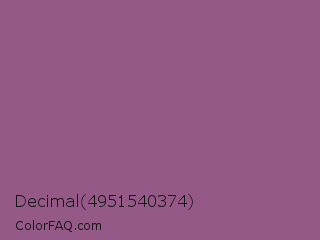 Decimal 4951540374 Color is a normal magenta color and the nearest color is Antique Fuchsia #915c83. Hex code #955988 and RGB value is rgb(149,89,136). In RGB color space, this color is composed of 58% red, 35% green, 53% blue, In CMYK color space, this color is composed of 0% cyan, 40% magenta, 9% yellow , 42% black , In HSL color space, this color has a hue angle of 313° , 25% saturation and 47% lightness.